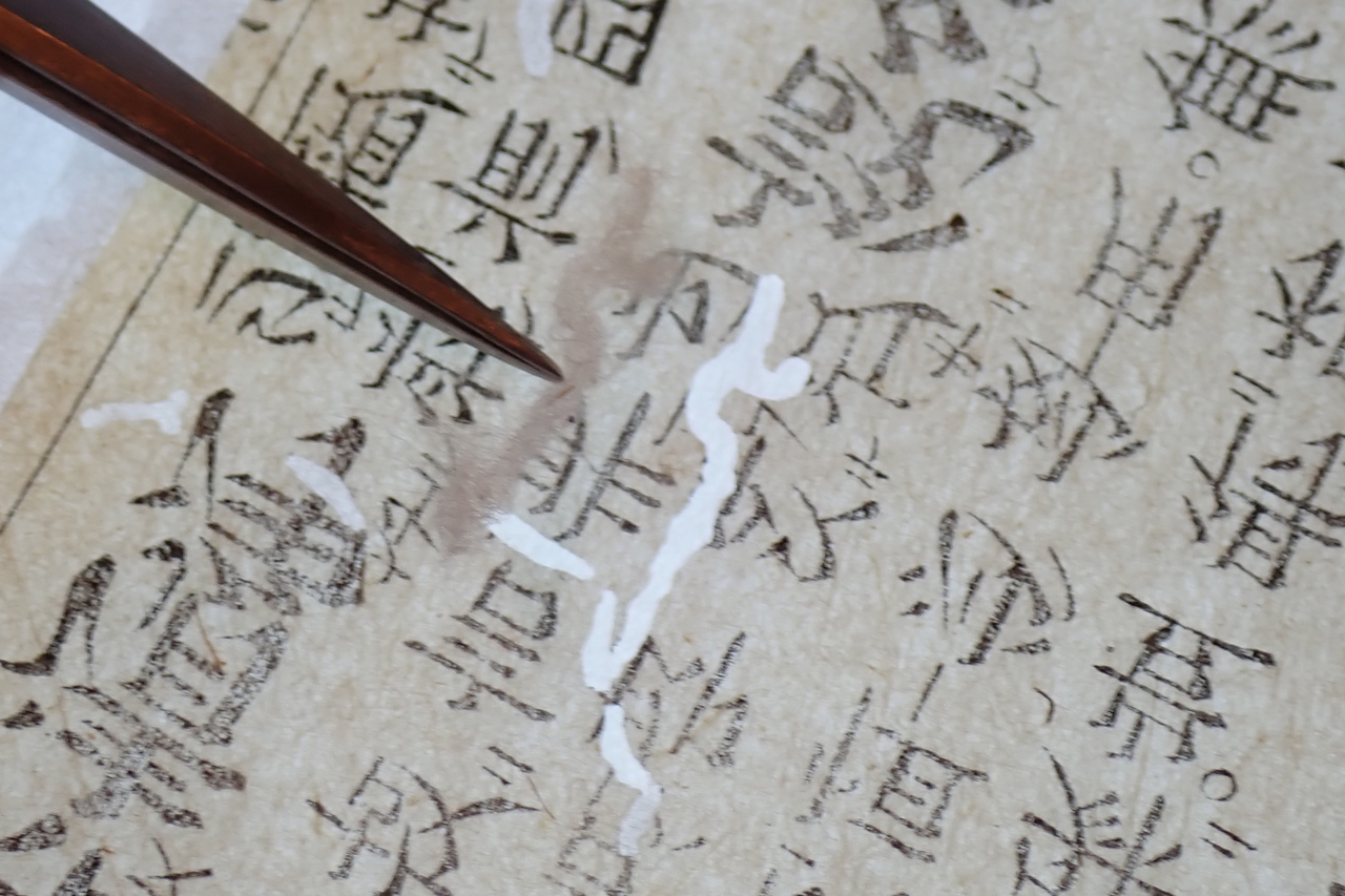 ・手繕いと異なり、補修紙を本紙に細かく合わせることが難しい点があります。