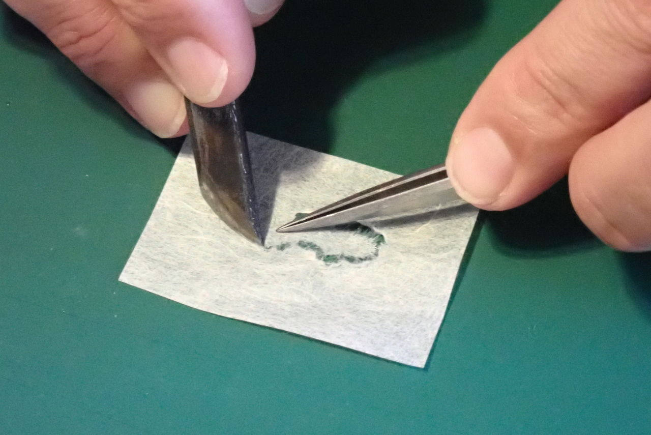 ・虫損部の形よりひと周り大きく(糊代分)、周りの小口をなだらかに削ぎ落として成形した補修紙を、本紙の裏面より小麦澱粉糊にて貼り充てます。